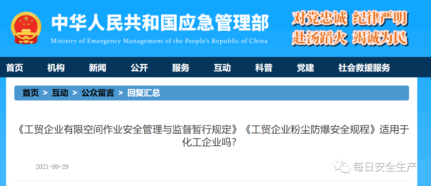 回复:感谢您的留言。《工贸企业有限空间作业安全管理与监督暂行规定》(安全监管总局令第59号)《工贸企业粉尘防爆安全规程》(应急管理部令第6号)均不适用于化工企业。回复单位: 安全执法和工贸监管局 回复时间: 2021-09-29