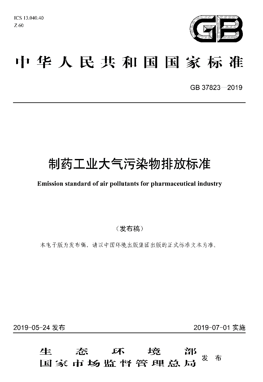 为促进制药工业的可持续发展,2019年5月生态环境部和市场监督管理总局联合发布了强制性标准:《GB 37823-2019制药工业大气污染物排放标准》,规定了制药工业大气污染物排放控制要求、监测和监督管理要求,并已于2019年7月1日起施行。